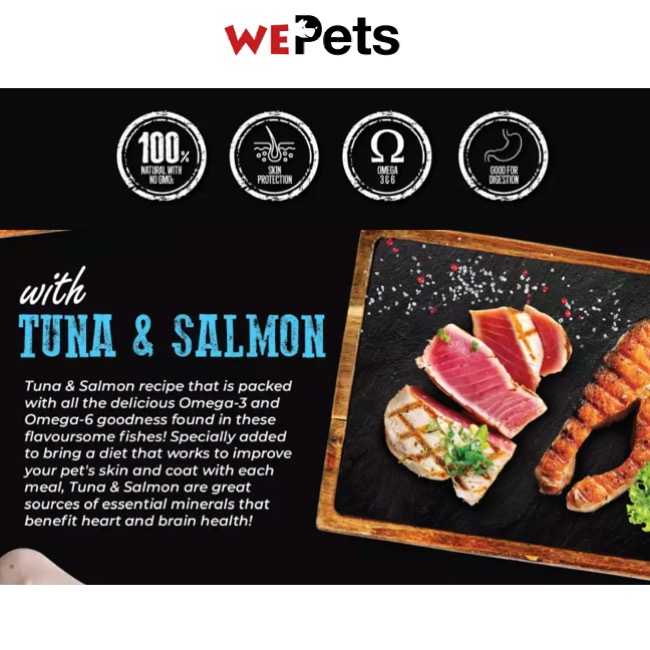 Kibbles in the bag - Tuna & Salmon:Introducing an all new revolutionary recipe formulated to provide your pet with a complete and balanced diet for life stages. Made with energy-rich ingredients including wild ocean fish that guarantees an optimal level of omega-3 and omega-6 to provide essential fatty acids to benefit your dogs inside and out. Every bag also contains wholesome cereals, FOS (fructooligosaccharides) and Yucca Schidigera to support digestion and prevent intestinal problems while also reducing inflammation with the presence of prostaglandins. Additionally, with the perfect balance of biotin and zinc, this diet is great for dogs of all lifestyles and tackles sensitive skin such as dandruff, itching, dermatitis etc.