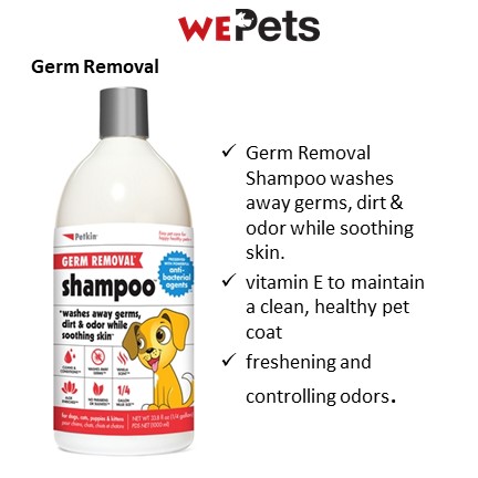 • Germ Removal Shampoo washes away germs, dirt & odor while soothing skin. Our gentle cleansing formula washes away germs like washing your hands. Enriched with aloe and vitamin E to maintain a clean, healthy pet coat while freshening and controlling odors.
