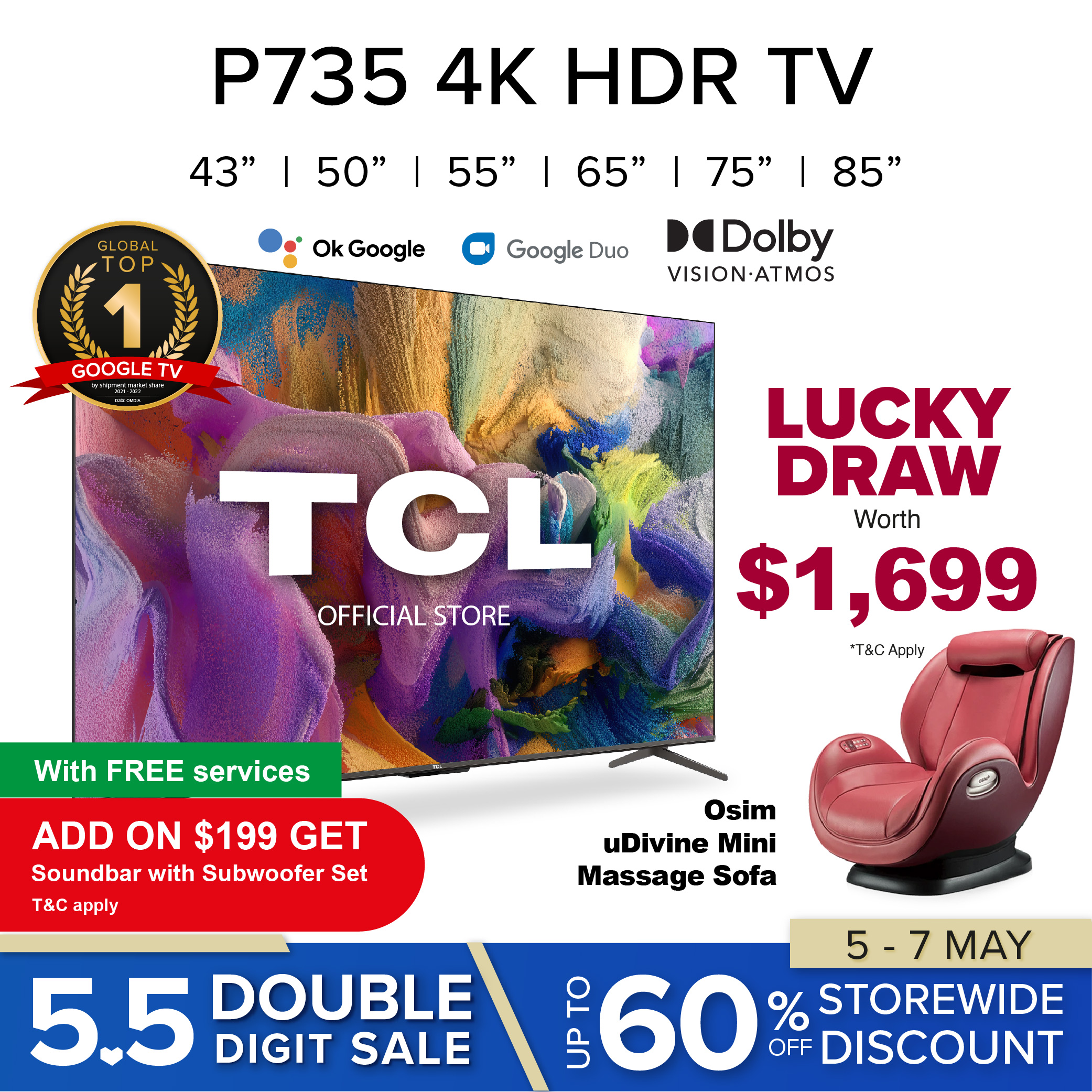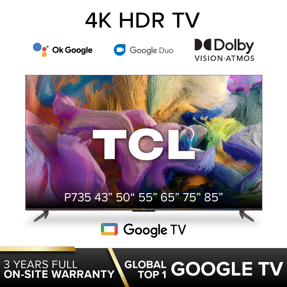 TCL P735 | P737 Google TV 43 50 55 65 75 85 inch | 4K HDR Bezel-less Slim Design | Google Assistant Duo | Wide Color Gamut | Dolby Cinematic Vision Atmos | HDMI | MEMC | Hands-Free Voice Control