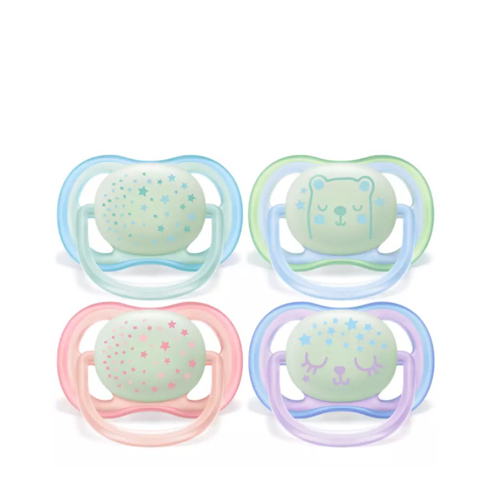 Soothe your baby with a pacifier that lets skin breathe and is easy to find at night. The Philips Avent ultra air night has extra large holes to keep skin dry, and a glow-in-the-dark button so you can see it while the lights are out.Lets skin breathe