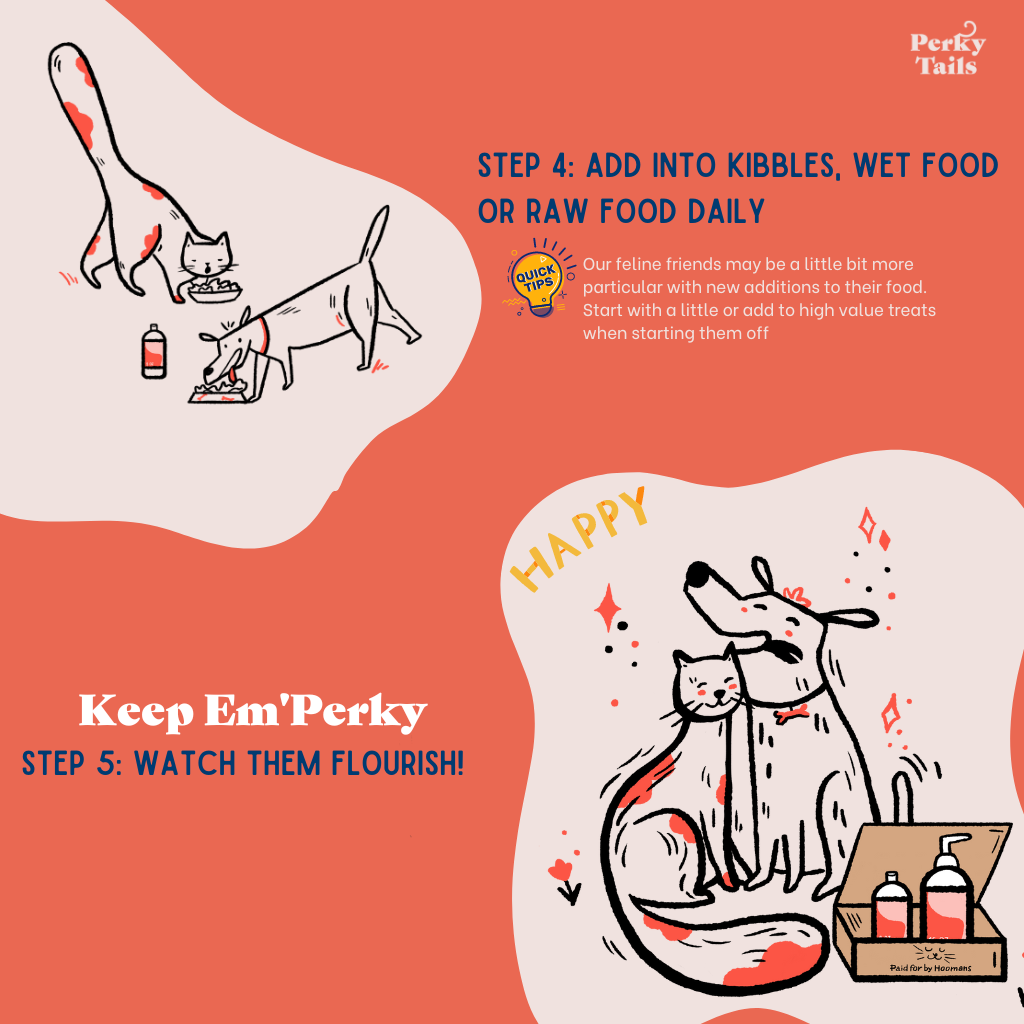 * Note - Recommended Serving Size of 1/2 pump for every 5.5kg is the daily recommended amount. Add the recommended pump into your pet's wet or dry food