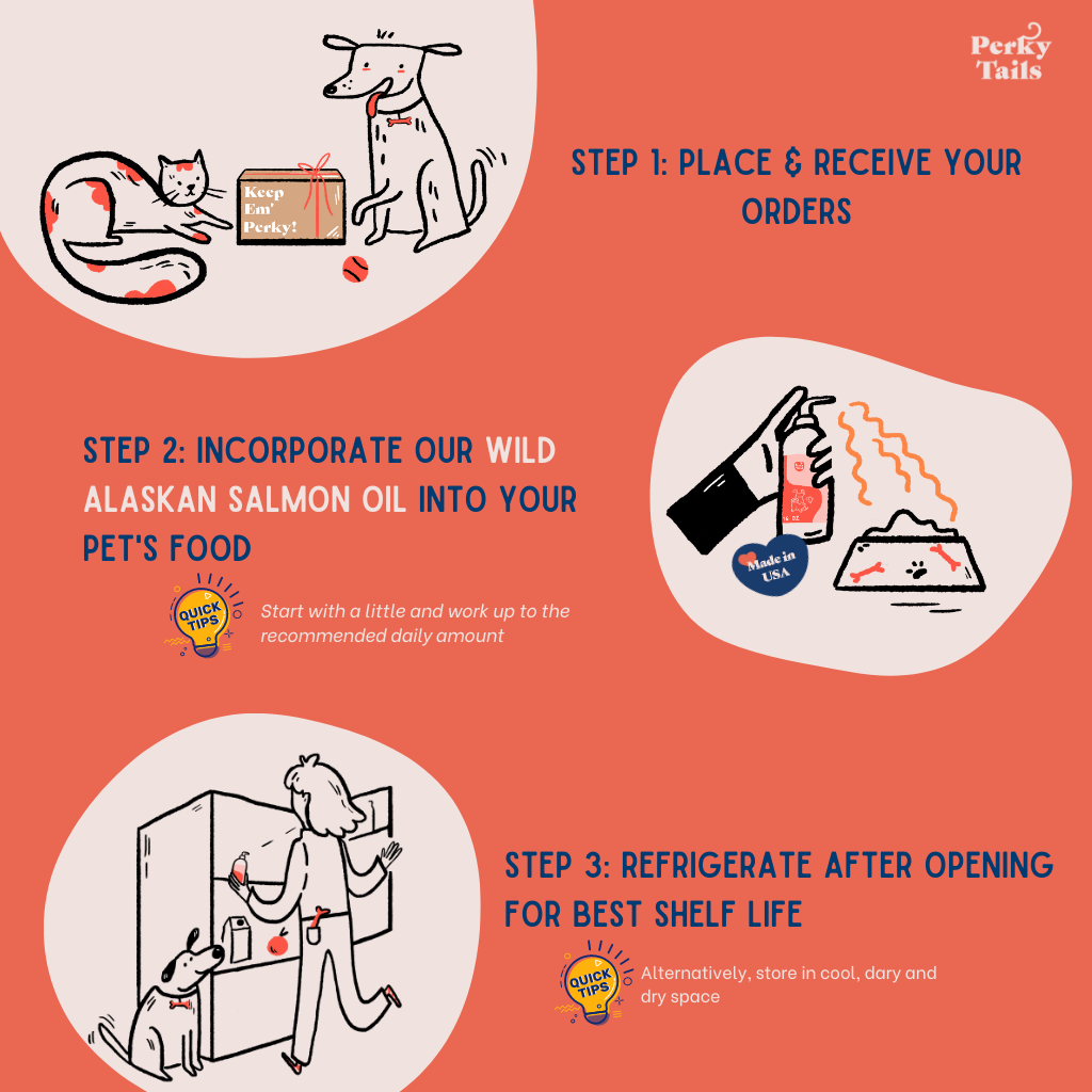 Perkytails Pure Wild Alaskan Salmon Oil for Dogs and Cats is a premium omega-3 fish oil that is great for skin and coat, joint, brain health and overall immunity!