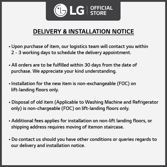 - LG reserves the right to replace the free gifts(s) (if applicable) with product(s) of similar value or while stocks last.