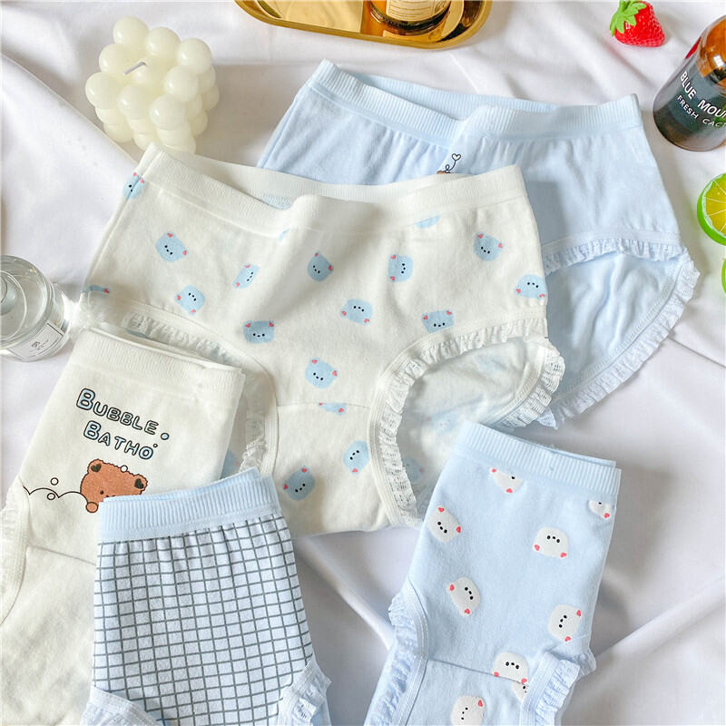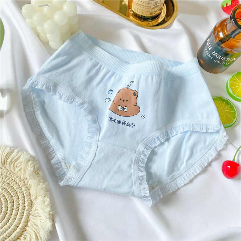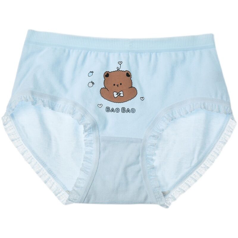 Cute Bear Minimalist Adorable Young Adult Underwear Mid Waist Classic Cotton Crotch Blue and White Students Triangle Shorts Breathable