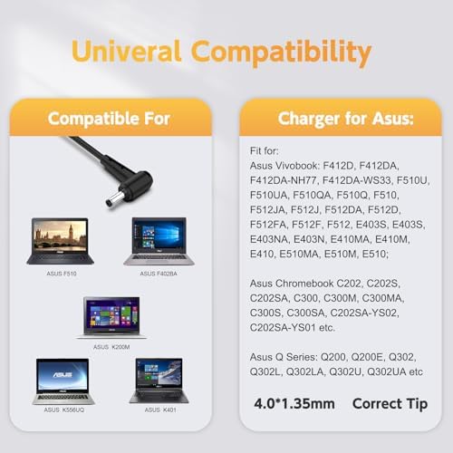 ? Output: 19V, 2.37A, 45W (Also Compatible with 33W, 19V, 1.75A); Input: 100-240V ; Connector: 4.0*1.35 mm. (Please check before purchase) ? Laptop Charger for Asus Vivobook 14 15 17: F412D, F412DA, F412DA-NH77, F412DA-WS33, F510U, F510UA, F510QA, F510Q, F510, F512JA, F512J, F512DA, F512D, F512FA, F512F, F512, E403S, E403S, E403NA, E403N, E410MA, E410M, E410, E510MA, E510M, E510; Asus Chromebook C202, C202S, C200MA, C202SA, C300, C300M, C300MA, C300S, C300SA, C202SA-YS02, C202SA-YS01 etc. ? AC Adapter for Asus Q Series: Q200, Q200E, Q302, Q302L, Q302LA, Q302U, Q302UA, Q303, Q303U, Q303UA, Q304, Q304U, Q304UA, Q324, Q324U, Q405U, Q405, Q503, Q503U, Q503UA, Q504, Q504U, Q504UA, Q505, Q505U, Q525, Q525U, Q553, Q553U, Q553UB. ? 45W Laptop Charger for Asus ZenBook: UX305F, UX360C, UX305FA, UX303U, UX305L, UX31A, UX330U, UX330UA, UX333FA, UX430U, UX430UA, UX433F, X512, X512D, X512DA, X512J, X515, X515J, X515JA, X540, X540L, X540LA, X540S, X540SA, X541, X541S, X541SA, X541U, X541UA, X202E, X451C, X541NA, X553MA, X712, X712F, X712J, D553M, F553, F553M, F553MA, F556, F556U, L402S, L402WA. ? Compatible with Asus T Series: TP201SA, TP201, TP201S, TP203, TP203N, TP203NA, TP300, TP300L, TP300LA, TP301UA, TP301U, TP301, TP401, TP401C, TP401CA, TP401N, TP410UR, TP410UA, TP410U, TP410, TP412UA, TP501U, TP501, TP510UA, TP510U, TP510, T304UA, T304U, T304, TX201, TX201L, TX201LA. (For more models, please refer to the description below) ? What You Get: 1 x AC Adapter (7.5Ft Cable), 365 Days Warranty Guaranteed by the Manufacturer and 24-hour friendly customer service. If you have any questions, please contact us.