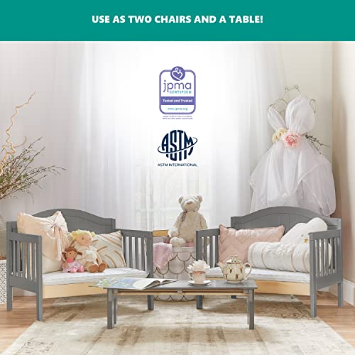 CONVENIENT TRANSITION BED: The Portland 3-in-1 Convertible Toddler Bed sports a low-to-floor design making it easy for your child to get in and out of bed. The bed comes with 4 wooden safety side rails and is reinforced for stability with center legs 3 in 1 CONVERTIBILITY: The Portland converts easily from a toddler bed into 2 kid-sized chairs and a table that complement any room setting. Keeps pace with the changing needs of your growing child. Conversion kit sold separately BEAUTIFUL AESTHETICS: Whether you want a traditional toddler room or a modern one, the elegant Portland fits in easily with its chic bell-shaped full panel headboard and footboard. Built of New Zealand pinewood, it is available in 5 elegant finishes SAFETY FOCUS: All our products are designed with the safety of your children in mind. The Portland is JPMA certified & meets/exceeds all applicable ASTM and CPSC standards. It is free of phthalates, latex, lead and BPA PRODUCTS SPECS: The bed dimensions are 57Lx29Wx28H inches. Each chair measures 29Lx29Wx18H; The table is 29Lx14Wx8H. Choose any Dream On Me non-toxic, Greenguard certified standard crib mattress for a perfect fit. Max weight limit for the bed is 50 lbs