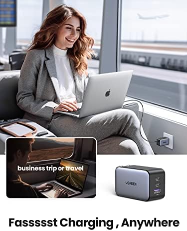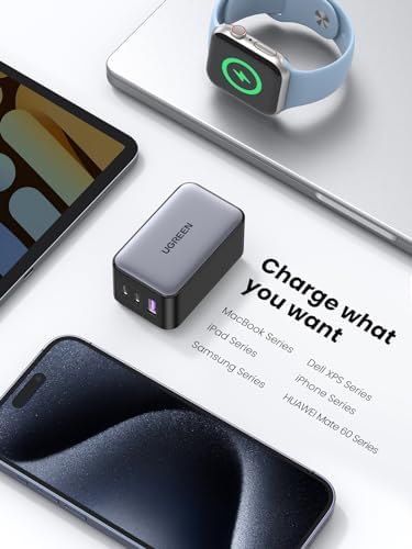 65W High Speed Single Port Charger: Connect a single USB C device to get a 65W max charge; Charge the MacBook Air M2 to 51% in 30 Minutes One Charger, More Devices: Ugreen's 65W USB C charger provides an enormous 65W of charging power; enough to fast charge phones, tablets, and laptops; All from a single charger Travel Friendly, Compact Design: Thanks to a cutting edge GaN chip, Ugreen's 65W USB C charger is 50% smaller than the original 61W USB C charger; A foldable plug provides more portability and a better travel experience Power Dispenser System: An intelligent system that reallocates power to protect and extend your device’s health Wide Compatibility: Broad support for multiple devices, MacBook Pro 16, MacBook Air M2 2022, MacBook Pro 13'' M2, iPad Pro, iPhone 15 Pro 14 13, Galaxy S24 Ultra S23, Switch, Steam Deck, and More