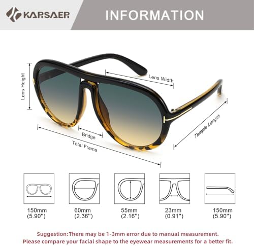 UNIQUE DESIGN - Karsaer oversized retro 70's aviator sunglasses with a classic aviator sunglasses look and stylish color scheme,Atmospheric simple design, smooth and silky curve, fashionable aviator sunglasses, give you the big protection and the most fashionable enjoyment. HIGH-DEFINITION UV400 LENSES - Karsaer's lenses can filter out sunlight reflected glare,protecting your eyes from long-term damage by blocking 99% of harmful UVA and UVB rays. HIGH QUALITY MATERIALS - These Karsaer oversized retro 70's aviator sunglasses are made of high quality PC frames, UV400 Acrylic lenses, solid metal hinges and strong screws, all the details to ensure you long lasting use. These stylish sunglasses are suitable for both women and men, for any climate and weather conditions. PRODUCT DIMENSION – Lens Width: 60mm(2.36inches) | Lens Height: 55mm(2.16inches) | Temple Length: 150mm(5.90inches) | Nose Bridge: 23mm(0.91nches).(Manual measurement, there is 1-3mm error) PERFECT DECORATION - These Karsaer classic fashion sunglasses are the perfect choice for outdoor activities such as taking selfies,shopping,driving,traveling,and are suitable as a high fashion accessory and daily wear all year round. #24,043 in Clothing, Shoes & Jewelry ( ) #225 in