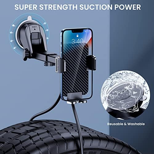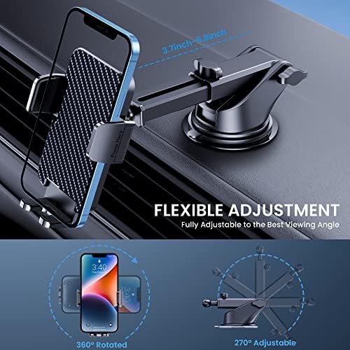 3-in-1 Car Phone Mount: Cell phone holder car can be mounted on the windshield, dashboard, or air vent, making it perfect for any car or truck. It's also a great assistant for Uber and Lyft drivers. Powerful Suction Cup: iPhone holder for car is equipped with super sticky suction and a double lock design for smooth and stable mounting when driving. To restore adhesion, simply rinse the sticky surface with warm water and wipe it dry. Flexible Telescopic Arm: Cell phone car mount features a rotating 360-degree ball for increased comfort and a safer driving experience. Car phone holder designs an improved telescopic arm that can be adjusted from 3.7 inches to 5.9 inches for various viewing angles. Full Phone Protection: Cell phone car holder with vacuum silicone rubber and thick panels that provide full protection for your phone from scratches and drops, even at high speeds, bumps, or turns. Device Compatibility: It is compatible with 4.0-7 inch cellphones including iPhones or Android devices even with thick cases. Phone car holder mount has a one-touch release button, allowing you to release your phone with one hand while driving.