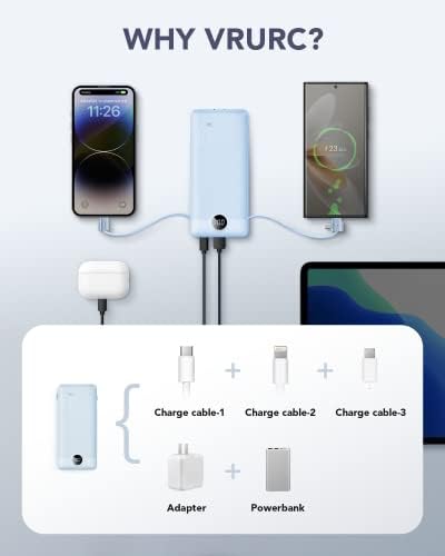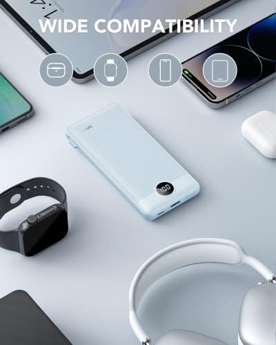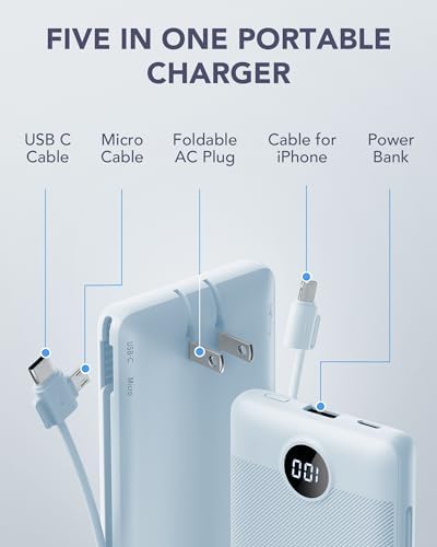 [Portable Charger With Built-in Cables & AC Wall Plug] Not only it has a built-in Micro cable, USB C cable, and other charging cable for iPhone, but also is equipped with a USB port,and USB C port. Also, Portable phone charger is built-in wall plug that charges the power bank itself directly from the wall outlet. [Slim & Compact Design] Product dimension is 5.9 x 2.8 x 0.7 in,weighing 8 Oz. Compact design is more convenient for us to carry on the go, and does not add any weight. [Smart Digital LED Display] You can know the remaining power at a glance via LED Display. Also, the 3D texture on the surface provides you with a better 3D touch and grip to prevent the power bank and phone from slipping off. [Wide Compatibility] Using the built-in charging cables to charge, the portable battery charger is compatible with iPhone, Android devices, and USB-C most mobile phones and smart devices etc. This external battery power bank can meet most of the charging needs of daily life. [PRODUCT PACKAGE] 1x Power Bank, 1x User Manual.