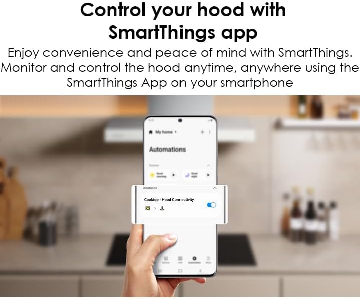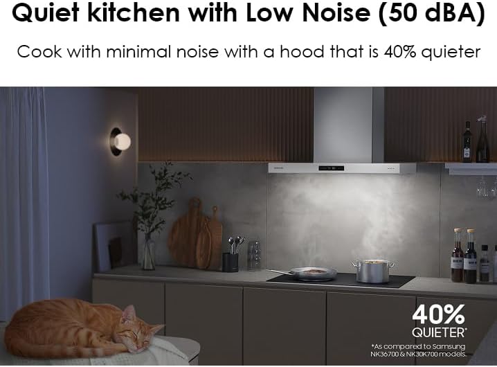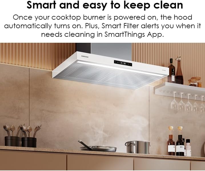 BESPOKE DESIGN: Available in a variety of Bespoke colors¹ to complement other appliances and express your personal style. Whether you prefer to match, complement or contrast – the choice is yours TRIPLE AIR SENSOR: A quiet hood that helps you cook with almost no noise at 50 dBA and has smart air sensor to keep air quality detection all day long WI-FI CONNECTIVITY: Monitor and control the hood anytime, anywhere using the SmartThings App on your smartphone; Automatically turns on once your cooktop burner is powered on VOICE CONTROL: Control your hood by voice when you’re busy doing other things by using your favorite virtual assistant, whether it’s Samsung Bixby, Amazon Alexa or Google Assistant LCD DISPLAY & TOUCH CONTROL: Use the touch of your finger to easily adjust settings on the LCD display touch controls