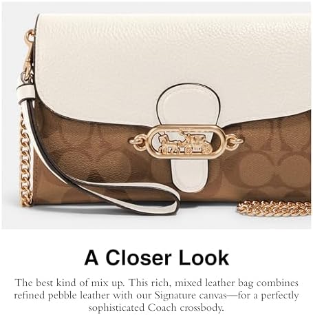 Editors Notes: Our Signature canvas and smooth leather Jade Chain Crossbody is a sophisticated style finished with a magnetic snap closure & a detachable long strap for shoulder or crossbody wear Our Signature Canvas: The best kind of mix up. This rich, mixed leather bag combines refined pebble leather with our signature canvas - for a perfectly sophisticated Coach crossbody On-the-go Essentials: This zippered small crossbody features ten credit card slots, a full-length bill compartment, inside zip pocket and a magnetic snap closure to keep essentials secure It's All in the Details: Ten credit card slots, Full-length bill compartment, Inside zip compartment, magnetic closure, fabric lining, Detachable wrist strap, Outside slip pocket, Detachable long strap with 22" drop, 8"(L) x 5"(H) x 3/4"(W)" This is COACH: Having the courage to be real since 1941. COACH is the Original American House of Leather - with a legacy of craft and a community that champions the courage to live authentically