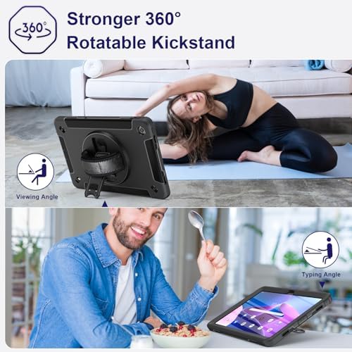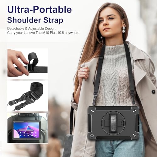 Compatible with Lenovo Tab M10 Plus 3rd Generation 10.6 Inch 2022 (Model:TB-125F/TB-128F) with Screen Protector. Three-Layer shockproof case has passed the Military Grade Drop Test.The Lenovo Tab M10 Plus 10.6" Case is made of 2 high-quality PC(Inner shell) and 1 soft flexible TPU(outer cover). Built-in sponge technology adds extra cushioning. Built-in 360-degree rotating stand supports in vertical/horizontal positions 3 angles (vertical, horizontal, middle). It can be used to support the Lenovo Tab M10 Plus 3rd Gen when watching movies, playing games, or typing, let your hands-free. Precise cutouts are designed for easy access to all buttons, controls, and ports, the case's port plugs keep dust out of the Lenovo Tab M10 Plus 10.6 and the micro design of the raised bezel above the screen/camera provides extra protection. The ergonomically adjustable hand strap is more easily gripped, and the matte coating prevents slipping out of your hand. A portable shoulder strap ensures maximum portability wherever you go. Release your hands completely during hiking, traveling, or other outdoor activities.[Miesherk provides 12 months warranty and after-sales service]