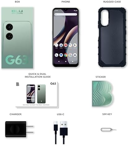 GSM Unlocked: Use your preferred GSM carrier with ease. Compatible with T-Mobile, Metro PCS, and others. Sim card not included. For availability on select networks, please consult your service provider. Note: This device is not compatible with AT&T/Cricket new activations or CDMA networks like Verizon and Sprint. Up to 3 Day Battery: 5,00mAh battery for stress-free use, the G63 will power through all your daily tasks. Elegance in mind: Smooth, textured finish with metallic accents and a side-mounted fingerprint sensor for instant, secure access. Look good, feel good, use with ease. Multitasking Master: 4GB RAM handles all your apps smoothly, from streaming to gaming to video calls. No more lag, just seamless performance. Capture Every Moment: Dual 13MP rear cameras with flash and an 8MP selfie let you capture stunning photos and videos. Share your world with confidence. Android 13 Ready: Experience the latest OS with all its new features and optimizations. The G63 is future-proof and ready for anything. Box content: G63, Rugged Case, Quick Guide, Sim Key, Charger, USB-C cable, Sticker.
